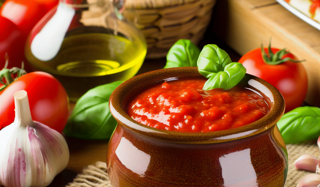 Tags / Categories: savory, tangy, Italian, Mediterranean, basil, garlic, simple, versatile, pasta sauce, pizza sauce, main ingredients: tomatoes, olive oil, garlic, region: Italy, usage: pasta, pizza, dipping, base for other dishes